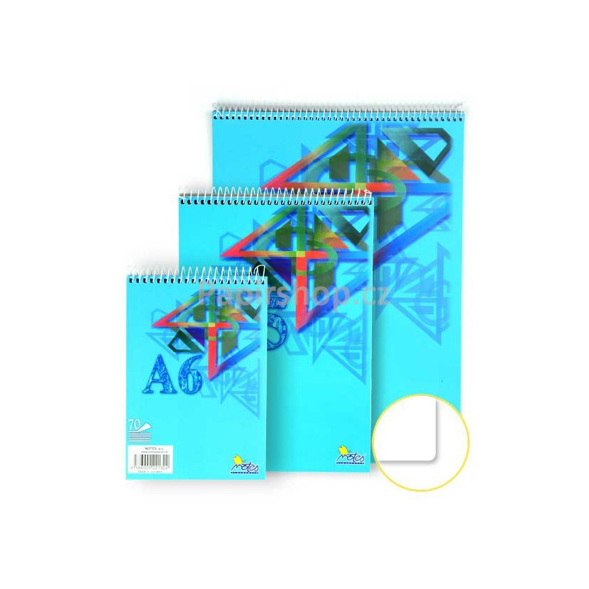 Blok A6 čistý so špirálovou väzbou hore, biely papier, 70 dierovaných listov s perforáciou pozdĺž hornej strany.