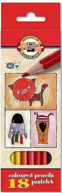 Neznačené drevené 18-farebné školské farbičky v papierovej krabičke. Dĺžka 175 mm, hrúbka farbičky 6,9 mm, hrúbka tuhy 3,2 mm. Obal s rôznymi motívmi.
