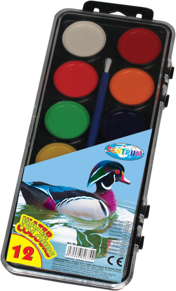 Školské vodové farby s motívom Zoo, 12 farieb, 30mm. Balenie obsahuje aj 1ks štetec.