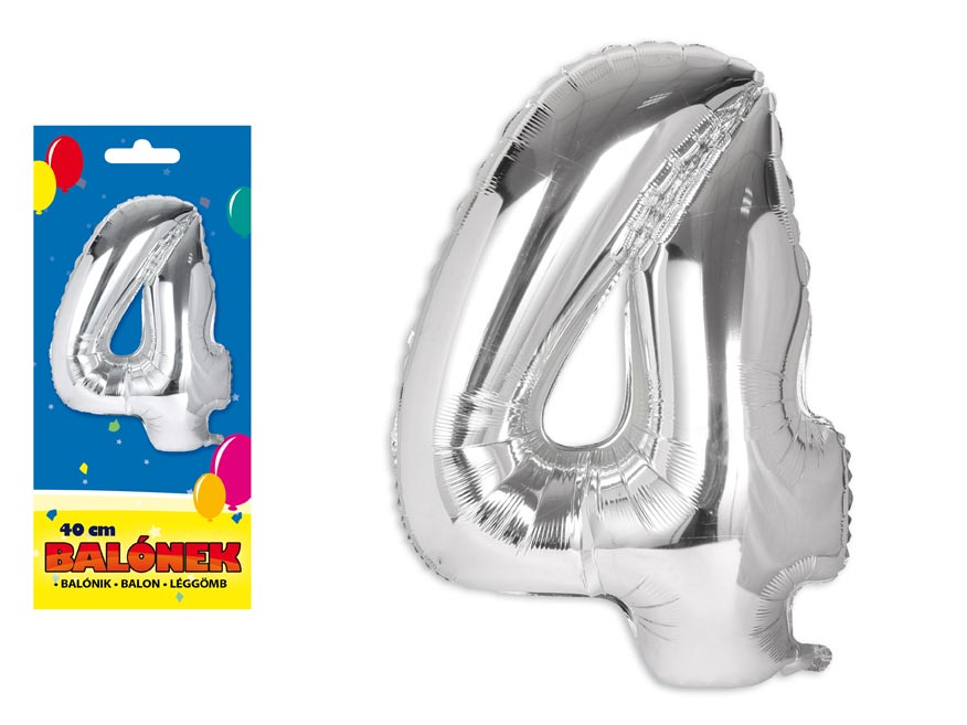 Nafukovací fóliový balónik v tvare čísla 4. Balónik je vyrobený zo striebornej fólie. Na hornom okraji balónu sú očká na priviazanie. Balóniky sú vhodné na narodeninové oslavy, firemné párty a iné spoločenské udalosti.Výška balónu: 40 cmUvedená