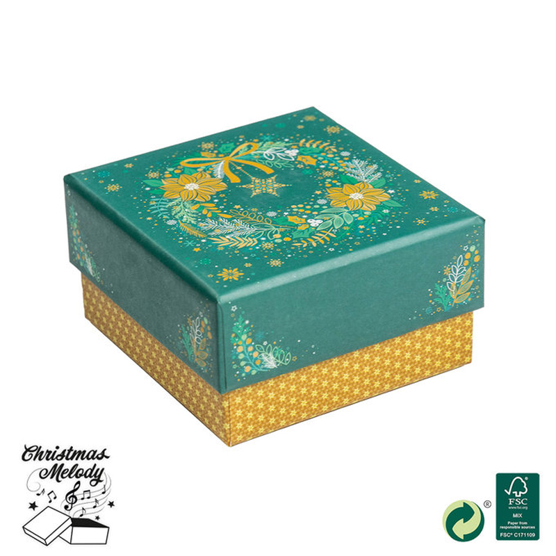 Vianočná darčeková krabička s hudbou. Po otvorení krabičky sa spustí skladba s vianočnou tematikou „Tichá noc''. Vianočné krabičky sú nádhernou možnosťou ako zabaliť drobnosti pre Vami milované osoby pod vianočný stromček. Krabička obsahuje batériu. Rozmery: 9,5 x 9,5 x 5 cm.