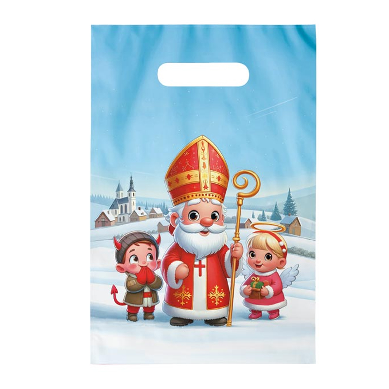 Igelitová taška s prehmatom a farebným mikulášskym motívom. Je ideálny pre rôzne typy darčekov, od malých sladkostí a hračiek až po väčšie predmety. Na taške je obrázok Mikuláša, anjela a čerta. Rozmer tašky: 20x30x8. Materiál PVC.