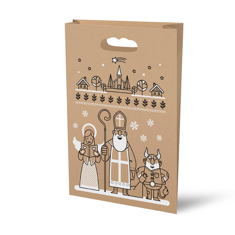 Vianočná papierová taška s priehmatom a čierno-bielou potlačou Mikuláša, anjela a čerta – ideálna na zhotovovanie čokoládových balíčkov pre deti. Rozmer: 260mm x 410mm x 110mm (Š x V x H) Vyrobené v EU.
