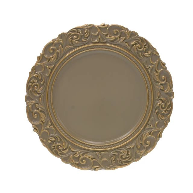 Dekoračný tanier okrúhly umelý. Môžete ho použiť ako podtanier alebo samostatnú dekoráciu na Váš stôl. Zakomponujte doň dekoratívne figúrky alebo sviečky a miestnosť získa nový charakter. Farba: sivo-zlatá. Materiál: plast. Rozmer: 33x33x2 cm.