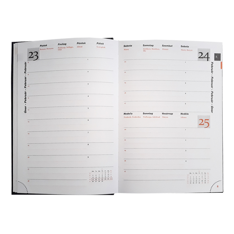 Formát: A5. Matná obálka s razbou roku. Tvrdá šitá väzba. Cena za 1 ks výrobku. Kvalitný diár s hodinovým delením (8:00 - 18:00) obsahuje slovenský, český, maďarský a nemecký preklad mesiacov a dní.
