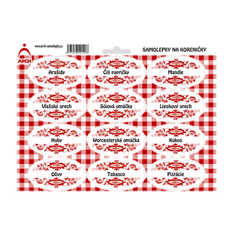 Samolepiace etiketky na koreničky, 12 ks na hárku. Oválne, cca 60 x 33 mm.