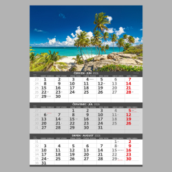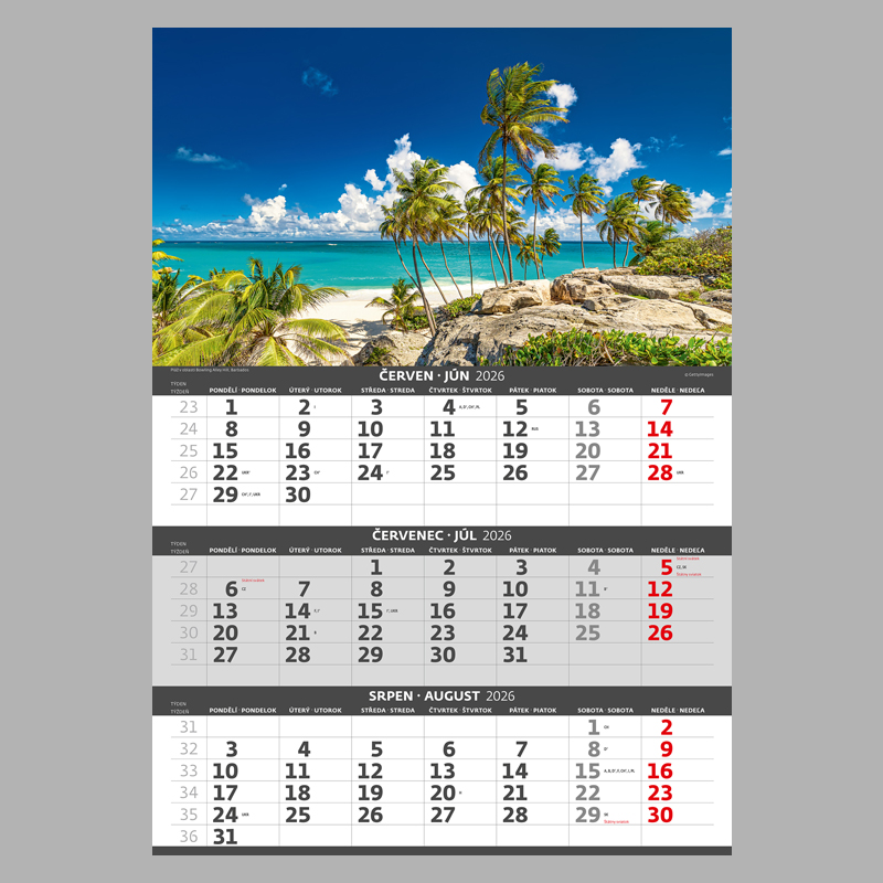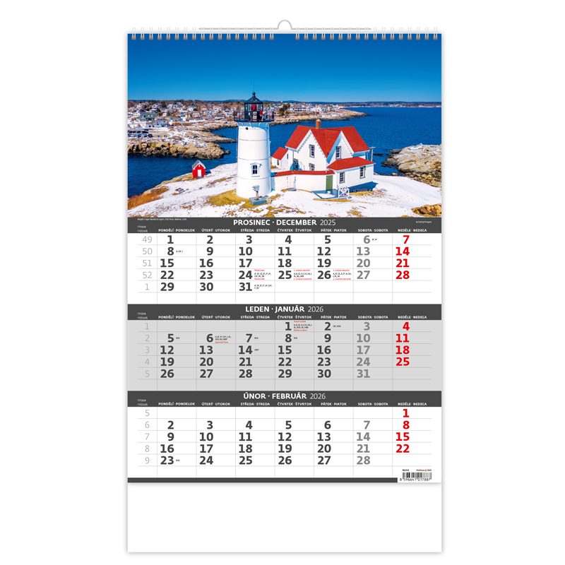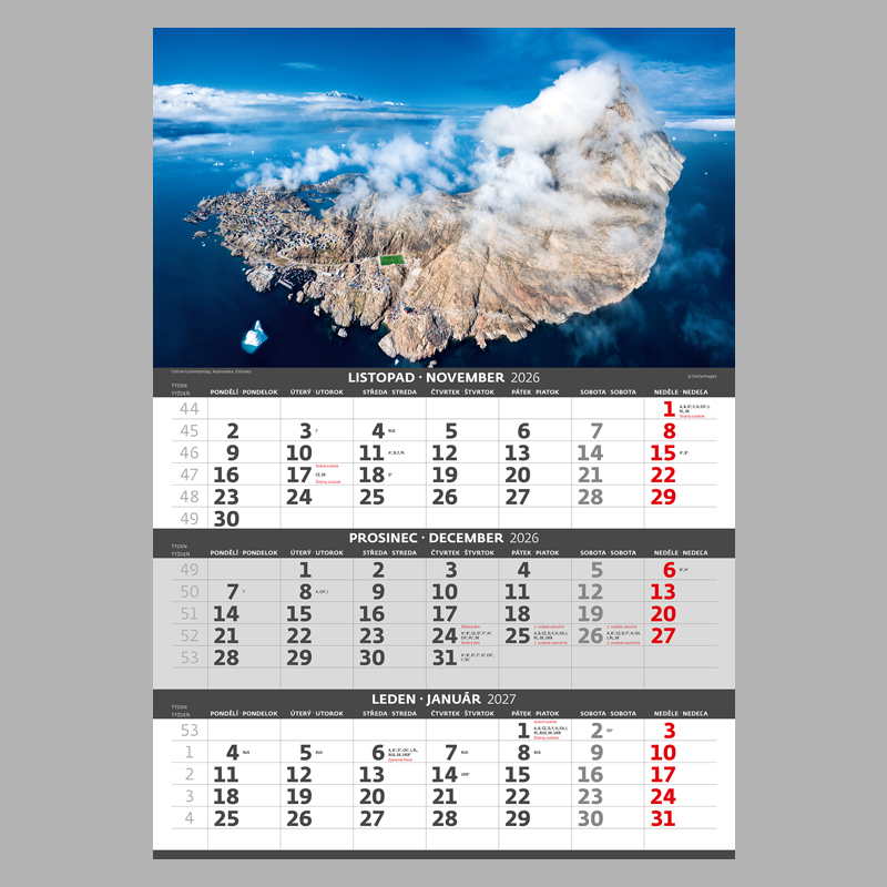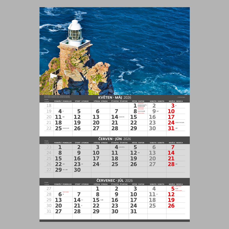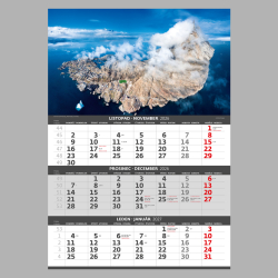 Formát kalendára: 31,5 x 45 cm • Kalendárium: české/slovenské trojmesačné so sviatkami európskych štátov (CZ / SK / A / B / D / F / H / CH / I / PL / RUS / UKR) • Rozsah kalendára: 12 listov • Priestor na potlač: 31,5 x 7 cm