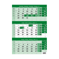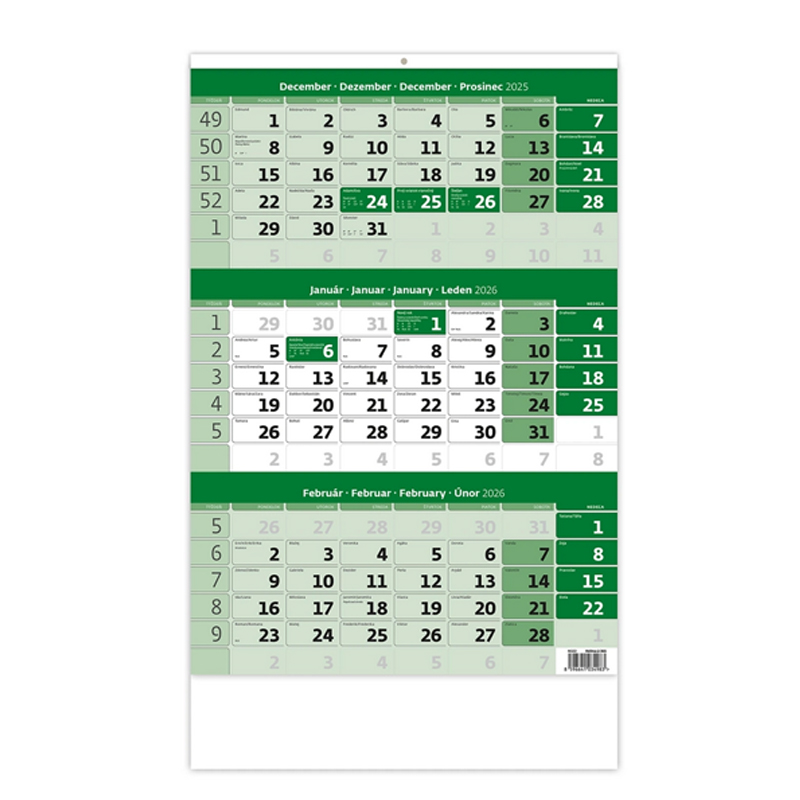 Formát kalendára: 31,5 x 45 cm • Kalendárium: slovenské trojmesačné so sviatkami európskych štátov (CZ / SK / A / B / D / F / H / CH / I / PL / RUS / UKR) • Rozsah kalendára: 12 listov • Priestor na potlač: 31,5 x 7 cm + laš 31,5 x 18 cm