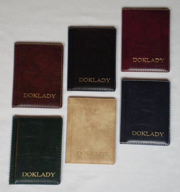 Šitý obal na doklady z mäkkej koženky v luxusnom prevedení, 6 zatavených vnútorných priehľadných plastových listov na doklady do veľkosti 114 x 80 mm a 2 samostatné plastové listy 90 x 55 mm na vizitky . Formát 127 x 97 mm.