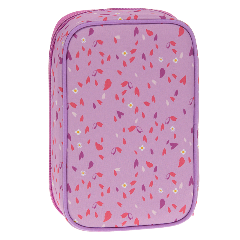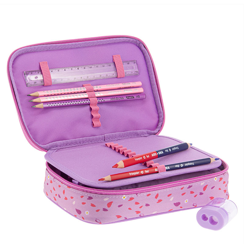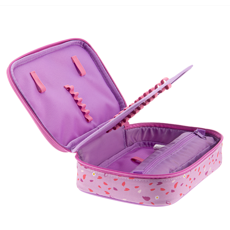 Detský školský jednoposchodový peračník s dvomi klopami, s 25 gumovými úchytmi na ceruzky a perá, gumu a prepážkou s priehľadnou fóliou a rozvrhom hodín. V peračníku je pravítko 15cm + guma + struhatko.
