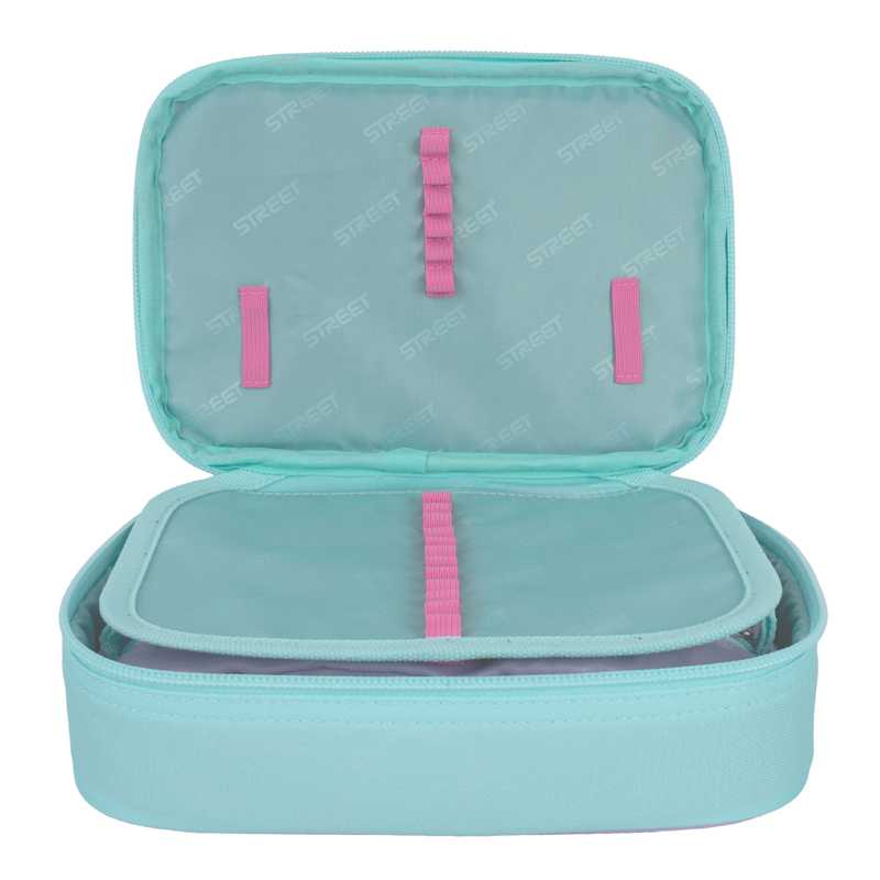 Školské púzdro v modernom prevedení. Vybavené pevnými zipsami a chlopňou s pevnými pútkami po oboch stranách. Pod chlopňou je miesto pre volné uloženie písacích potrieb či iných drobností. Vhodné pre školákov na 2. stupni a starších študentov. Puzdro je ľahko umývateľné.Rozmer: 22x10x5cm.