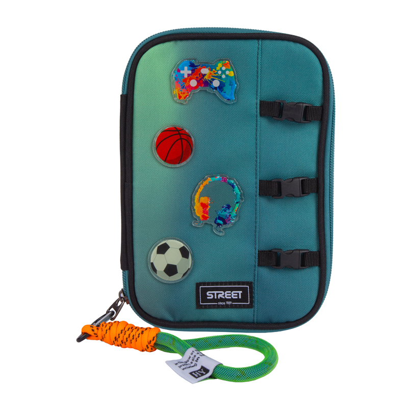 Prázdny jednoduchý peračník s jednou klopou,s gumovými úchytmi na ceruzky a perá, vreckom na suchý zips vhodným na peniaze, gumu a prepážkou s priehľadnou fóliou a rozvrhom hodín. Výška 20,0 cm