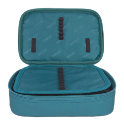 Prázdny jednoduchý peračník s jednou klopou,s gumovými úchytmi na ceruzky a perá, vreckom na suchý zips vhodným na peniaze, gumu a prepážkou s priehľadnou fóliou a rozvrhom hodín.
