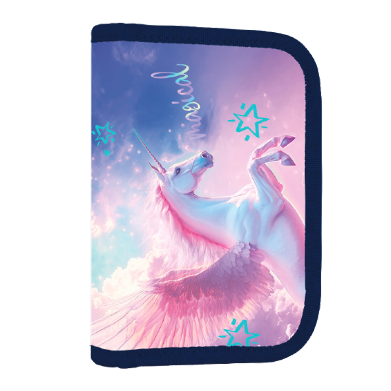 Prázdny jednoduchý peračník s jednou klopou,s gumovými úchytmi na ceruzky a perá, vreckom na suchý zips vhodným na peniaze, gumu a prepážkou s priehľadnou fóliou a rozvrhom hodín.
