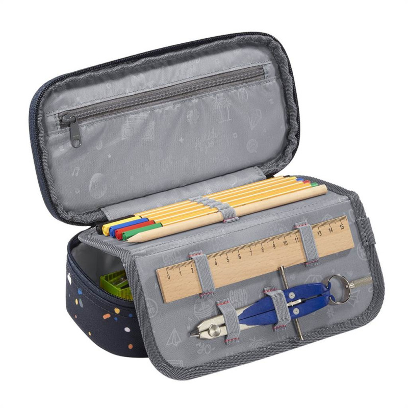 - peračník na perá, ceruzky, pravítka, uhlomer, gumu a ďalšie školské potreby - BEZ VYBAVENIA - vrecko na zips vo veku peračníka - gumičky na zasunutie 6 ceruziek alebo pasteliek - ďalších 7 väčších pútok pre príslušenstvo (napr. pravítko, kružidlo, gumu, malý trojuholník) - okienko na rozvrh hodín - vnútorné veko sa dá otvoriť a zavrieť suchým zipsom - zatváranie na zips - EKOLOGICKÝ VÝROBOK, LÁTKA JE VYROBENÁ Z RECYKLOVANÝCH PET FLIAŠ - vyrobené v súlade s trvale udržateľným rozvojom a so zásadami organizácie bluesign®, ktorých sme hrdým partnerom - vyrobené v prevádzke s dobrými sociálnymi a bezpečnostnými podmienkami pre zamestnanca, člen organizácie amfori Technické parametre: - materiál: polyester - rozmery: v.6 x š.24 x h.11 cm - hmotnosť: 170 g