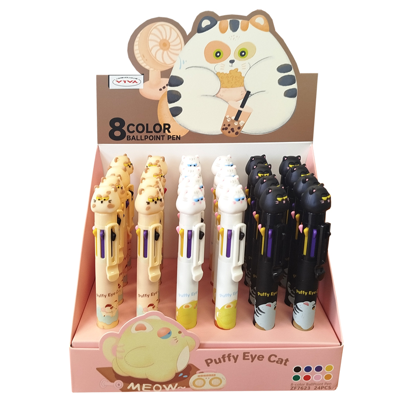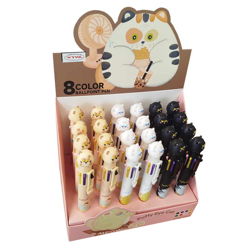 Zapínacie 8 - farebné guličkové pero (click clip) s motívom mačky. Pero obsahuje: čiernu, modrú, červenú, zelenú, oranžovú, ružovu, žltú a fialovú tuhu. Balenie: 24ks. Dodávané ako mix motívov bez možnosti výberu konkrétneho motívu.