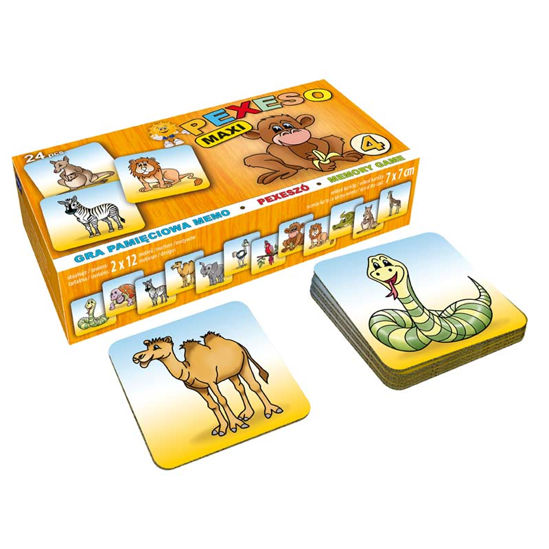 Hra Pexeso LUX obsahuje 12 motívov hracích kariet po 2ks. Veľkosť kartičiek: 7x7cm. Karty sú vyrobené z tvrdej lepenky cca 2,5mm a majú zaguľatené rohy, čo ich robí optimálnym pre malé deti.