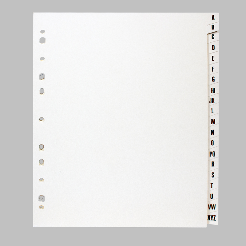 Kartónové rozraďovače formátov A4 . Umožňujú abecedné triedenie. Univerzálne dierovanie, predtlačený popisovateľný titulný list. Formát A4 umožňuje využitie rozraďovača pri ukladaní dokumentov v prospektových obaloch.