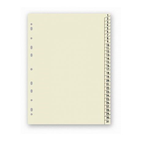 Kartónové rozraďovače formátov A4 . Umožňujú číselné triedenie. Univerzálne dierovanie, predtlačený popisovateľný titulný list. Formát A4 umožňuje využitie rozraďovača pri ukladaní dokumentov v prospektových obaloch.