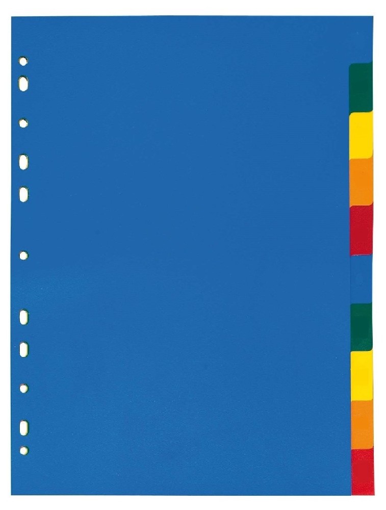 Plastové rozraďovače farebné formátov A4 . Umožňujú číselné triedenie. Univerzálne dierovanie, predtlačený popisovateľný titulný list. Formát A4 umožňuje využitie rozraďovača pri ukladaní dokumentov v prospektových obaloch.