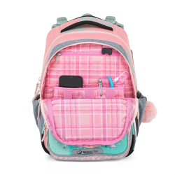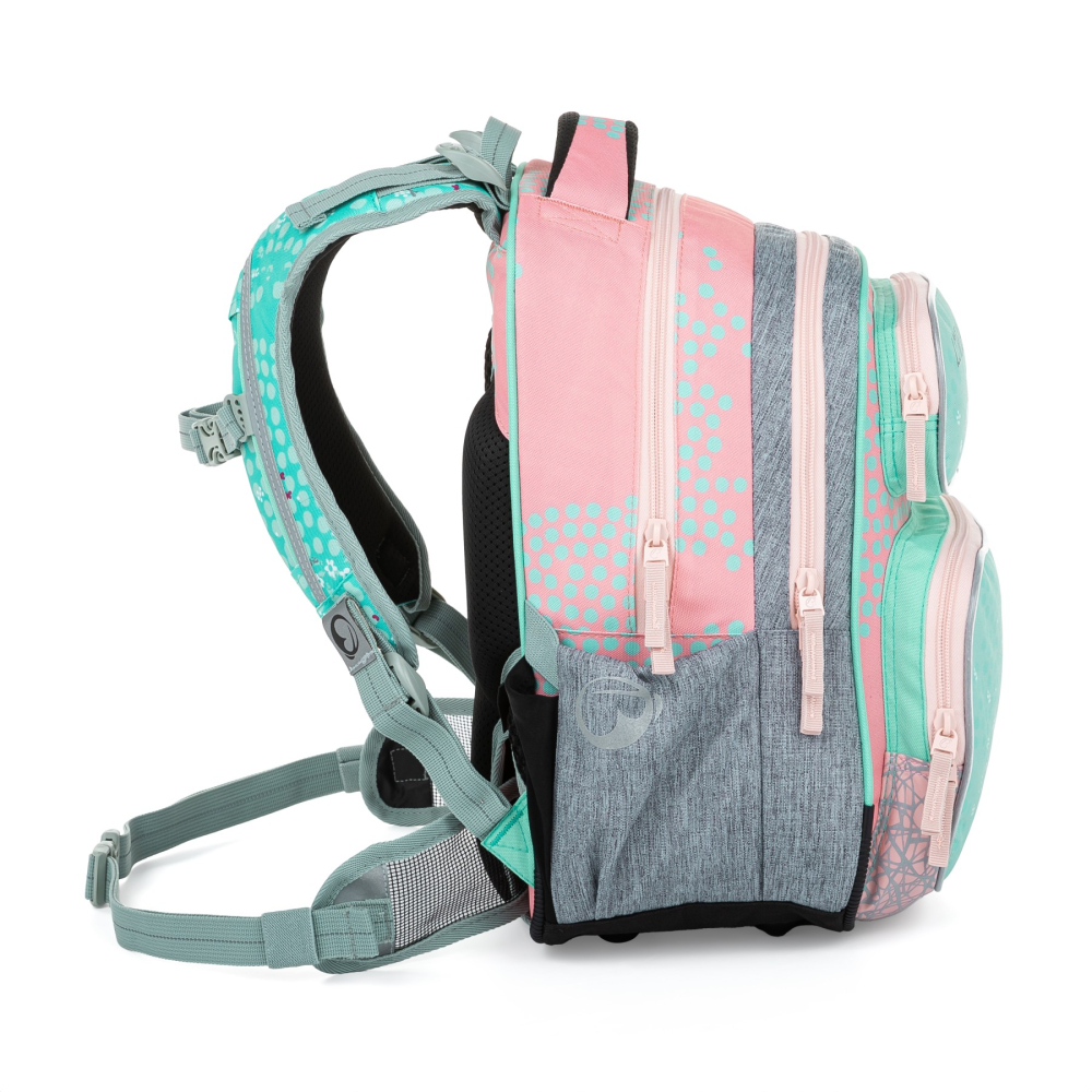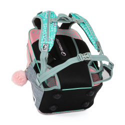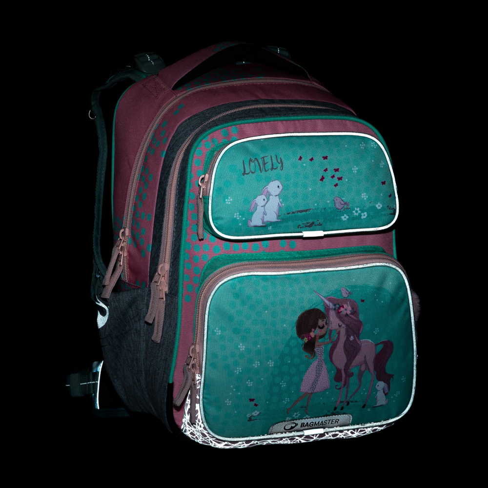 Dúhový batoh do školy s jednorožcom pre malé slečny od 1. do 3. triedy. Ide o extra ľahký, pritom priestranný školský ruksak. Má dve veľké komory a dve praktické predné vrecká. Chrbtový systém s nastaviteľným hrudným pásom a odľahčeným vyberateľným bedrovým pásom myslí na zdravý chrbát detí. Podrobný popis: Ergonomicky tvarovaný chrbát a priedušný bedrový pás na správne držanie tela. Flexibilný hrudný pás, vďaka ktorému ramenné popruhy neschádzajú z ramien. Ramenné popruhy aj chrbtový panel mäkko polstrované. Konce popruhov magnetické, dajú sa pripnúť nad plastovú sponu. Ramenné popruhy dostatočne široké (7 cm), nezarezávajú sa do ramien a sú príjemne mäkké. Dve priestranné komory. Do hlavnej sa zmestia veľké školské dosky aj učebnice a zošity formátu A4. V hlavnej komore kompresné vrecko s elastickými postrannými pásmi na dosky A4 a na veľké učebnice. Na prednej strane batohu dve menšie vrecká na drobnosti, spodné vrecko vhodné pre peračník alebo krabičku na desiatu. Čierna pracka v prednej komore vhodná na pripnutie sieťovaného vrecka. Dve bočné sieťované vrecká vhodné na fľašu s pitím alebo napríklad dáždnik. Technické parametre: Rozmery: 40 x 29 x 21 cm Hmotnosť: 0,92 kg Objem: 22 l Nosnosť: 7 kg Výrobca: Bagmaster