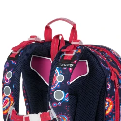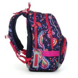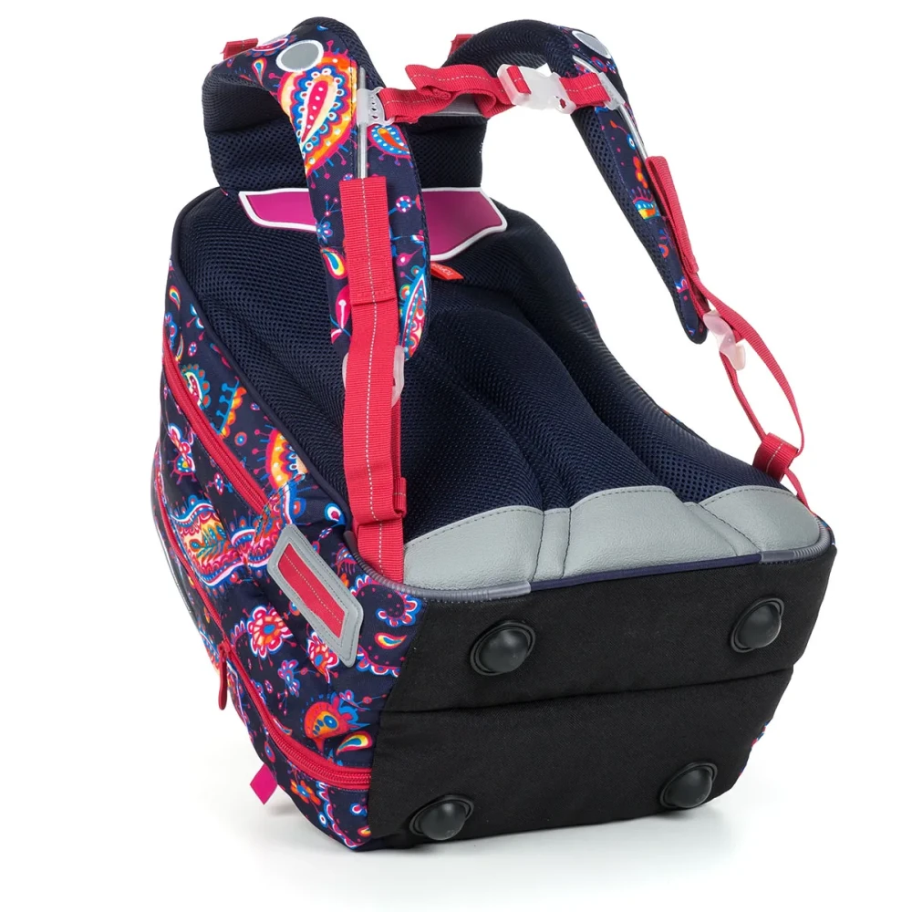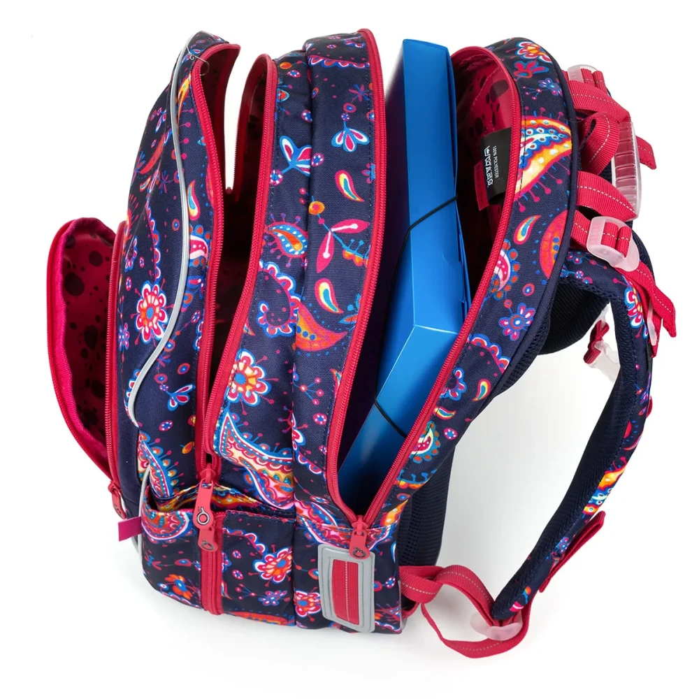 Dvojkomorová taška pre dievčatá v 2. - 5. triede pevný chrbát s ľahkou hliníkovou výstužou hravá potlač v obľúbených farbách dve objemné komory a malé vrecko Dve komory nášho obľúbeného modelu KIMI sme zväčšili tak, aby sa do nich zmestili všetky školské potreby vašho dievčaťa na prvom stupni ZŠ. Navyše florálny motív je hitovka a hneď tak nevyjde z módy, takže batôžtek môžete používať určite aj niekoľko rokov v rade. Chrbát batohu KIMI je mäkko polstrovaný a vďaka hliníkovému rámu, ktorý váži iba 0,06 kg, aj ergonomicky tvarovaný. Preto radíme rám nevyťahovať, drží chrbát tašky v správnom tvare. Polstrované ramenné popruhy sú taktiež ergonomicky tvarované. Dajú sa utiahnuť na výšku v spodnej časti a k ??telu v ich hornej časti. Hrudná pracka pomôže pri nosení naozaj ťažkého nákladu. Spodná časť popruhov sa vďaka magnetu dá upnúť k ich polstrovanej časti. Obe komory tašky sú dostatočne široké, objemné a zmestí sa do nich všetok školský náklad učenia. Len malá rada od nás, do zadnej komory umiestňujte tie najťažšie učebnice, chrbát vašich detí vám za to určite v budúcnosti poďakuje. Predná komora je ešte o niečo širšia ako zadná, nájdete v nej praktickú sieťovú kapsu na zips a menovku. K taške môžete prikúpiť peračník v rovnakom dizajne PENN 19010, ktorý sa zmestí aj do predného menšieho vrecka, ale pokojne ju môžete použiť ako kapsičku na desiatu. V malej prednej kapsičke nájdete aj karabínu na kľúče. Fľaštičku s pitím potom umiestnite do bočného vrecká tašky. Taška KIMI je samozrejme vybavená radom reflexných prvkov na všetkých jeho stranách. Skontrolovať si túto skutočnosť môžete v detailných fotkách, kde ju máme vyfotenú v tme. Bonus: pevné nepriepustné dno tašky z látky TOPDURA nožičky chrániace dno batohu a záter proti dažďu pútko na lavici a na prenášanie v ruke batoh bol testovaný v ITC Zlín na jedničku Náš tip: Nedávajte deťom do školy fľaštičku plnú pitia, šetrite im chrbát. Ako? Jednoducho. Dajte im iba fľaštičku, do ktorej dáte šťavu a nechajte ich, aby si vodu dopustili z kohútika až v škole.