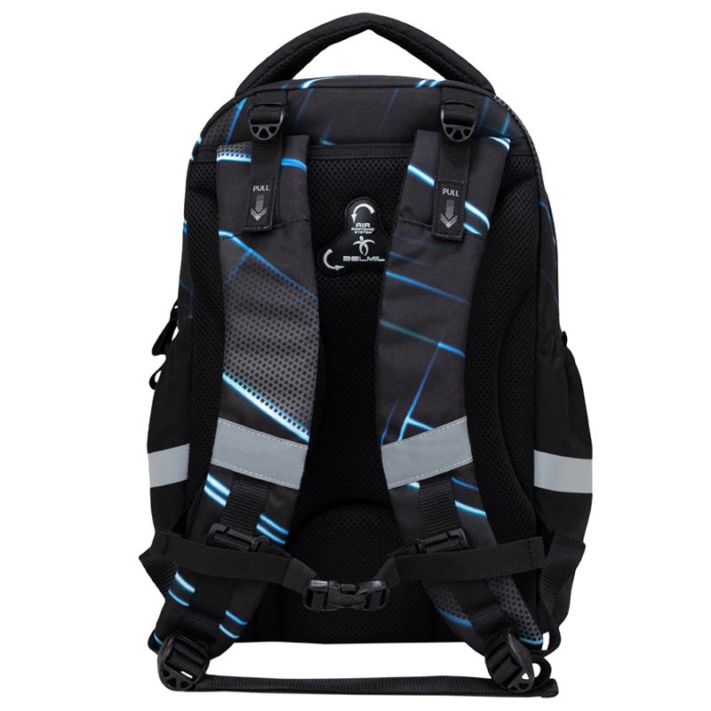 Školská taška váži iba 1 kg. Lisovaná chrbtová časť tašky je anatomicky tvarovaná. Taška má tiež špeciálny sieťovaný materiál pre maximálne vetranie na chrbte a nastaviteľné popruhy na ramená so silným polstrovaním pre pohodlné nosenie. Spolu s ergonomicky tvarovanými popruhmi, ktoré sa dajú utiahnuť v hornej aj spodnej časti, zaistia správne nosenie na chrbte školáka aj pri dennom náklade niekoľkých kíl učenia. Na taške sa nachádza hrudný popruh. Okrem toho, taška Belmil je výrazná tým, že zahŕňa zosilnené dno ruksaku s nožičkami pre stabilitu pri postavení na zem.