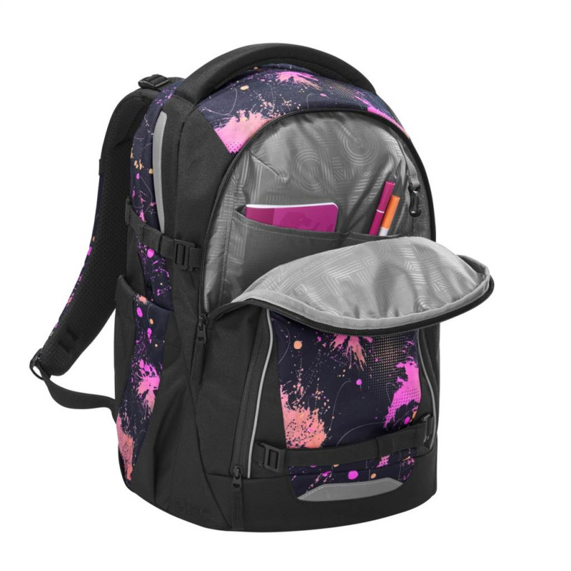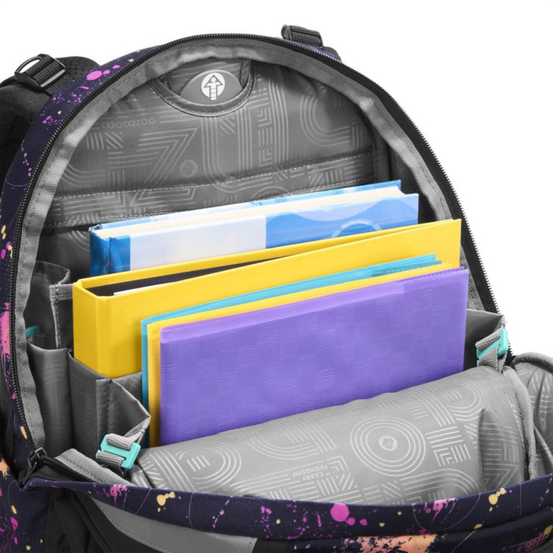 - veľký hlavný priečinok s priehradkou na knihy a odnímateľnou priehradkou, vrecko s organizérom a predné vrecko napr. na desiatovú krabičku