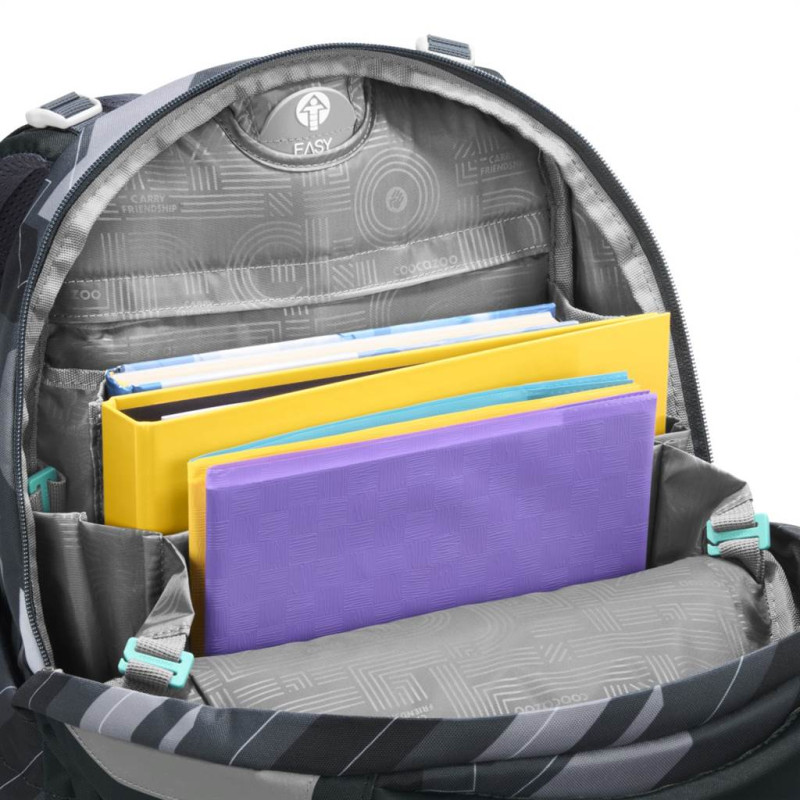- veľký hlavný priečinok s priehradkou na knihy a odnímateľnou priehradkou, vrecko s organizérom a predné vrecko napr. na desiatovú krabičku