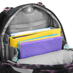 - veľký hlavný priečinok s priehradkou na knihy a odnímateľnou priehradkou, vrecko s organizérom a predné vrecko napr. na desiatovú krabičku