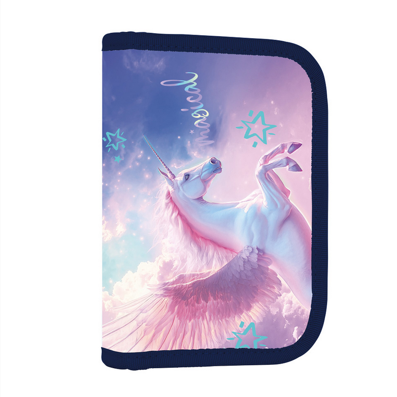 Prázdny jednoduchý peračník s jednou klopou,s gumovými úchytmi na ceruzky a perá, vreckom na suchý zips vhodným na peniaze, gumu a prepážkou s priehľadnou fóliou a rozvrhom hodín.