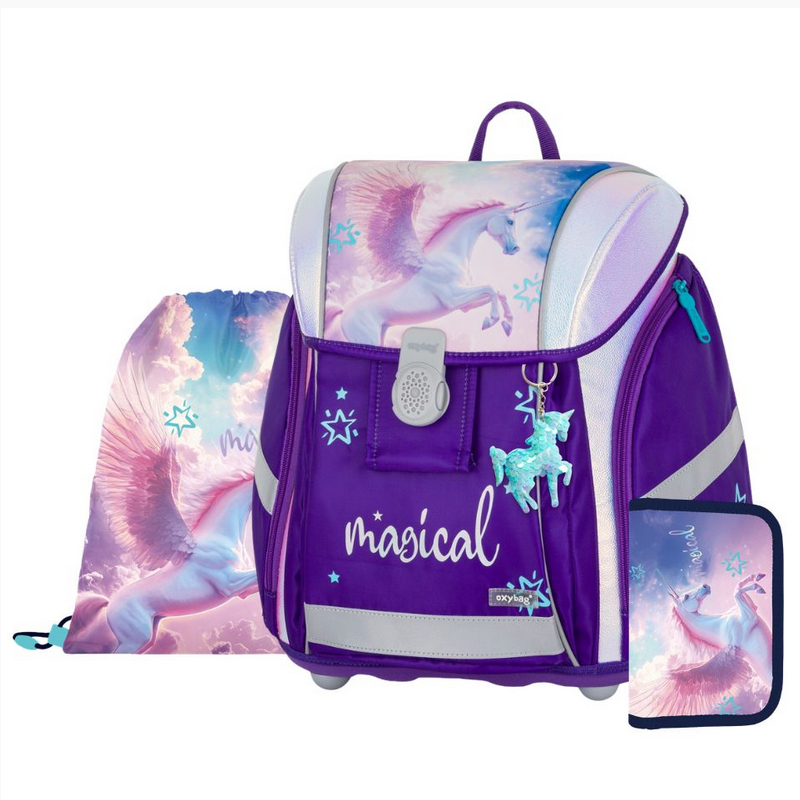 Trojdielny školský set sa skladá zo školskej aktovky Oxybag Premium Light, jednoposchodového prázdneho peračníka, viacúčelového vrecka na prezúvky.