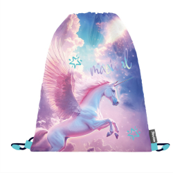 Vrecko sa sťahuje pomocou šnúrok, ktoré vedú cez celú zadnú časť a dá sa nosiť na chrbte alebo na ramene. Je vhodné na prezuvky alebo aj na oblečenie na telesnú výchovu alebo na každodenné nosenie. Rozmer: 32x42 cm.