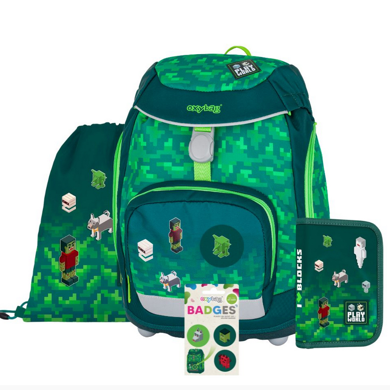 Trojdielny školský set sa skladá zo školskej aktovky Oxy Sherpy, jednoposchodového prázdneho peračníka, viacúčelového vrecka na prezúvky.
