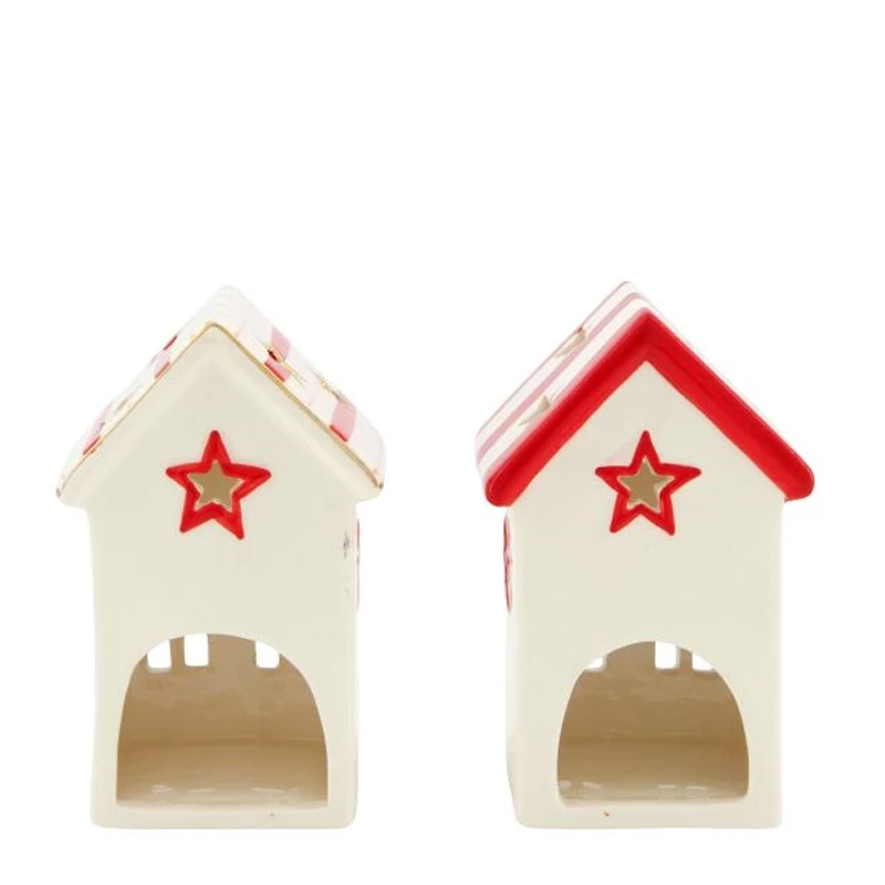 Dekoračná vianočná ozdoba - svietnik v tvare domčeka. Farba: bielo-červená. Materiál: porcelán. Rozmer: 7,7x7x12 cm.