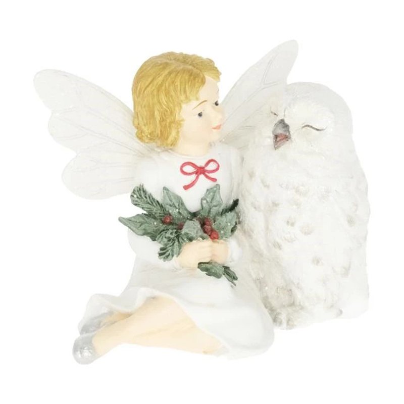 Dekoračná vianočná ozdoba - víla sediaca so sovičkou. Farba: biela. Materiál: polyresin. Rozmer: 13,8x7,9x11,1 cm.