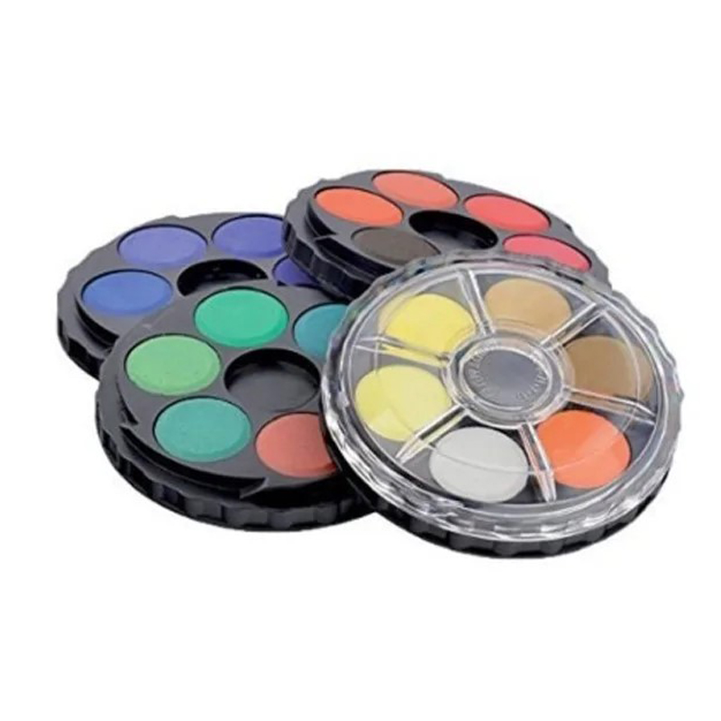 Vodové farby s priemerom tabliet 22,5 mm s 24 brilantnými odtieňmi vhodné pre špeciálne výtvarné techniky, napr. pre kolorovanie fotografií, maľby portrétov, maľby na dekoračné predmety, zdobenie kraslíc ai. Vložené v plastovom farebníku s transparen