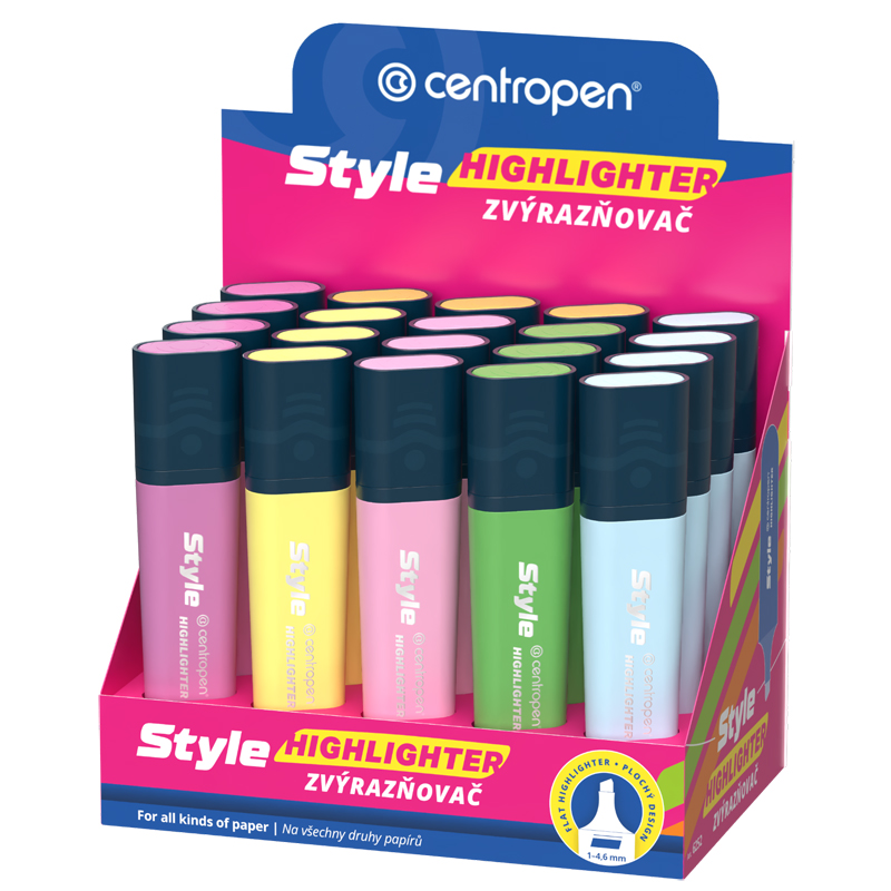 Zvýrazňovač centropen v modernom designe. Pre hladké a pohodlné zvýraznenie textu na všetkých druhoch papiera. Zvýrazňovač má klínový hrot. Šírka stopy 1–4,6 mm. V displeji sa nachádza 20ks.